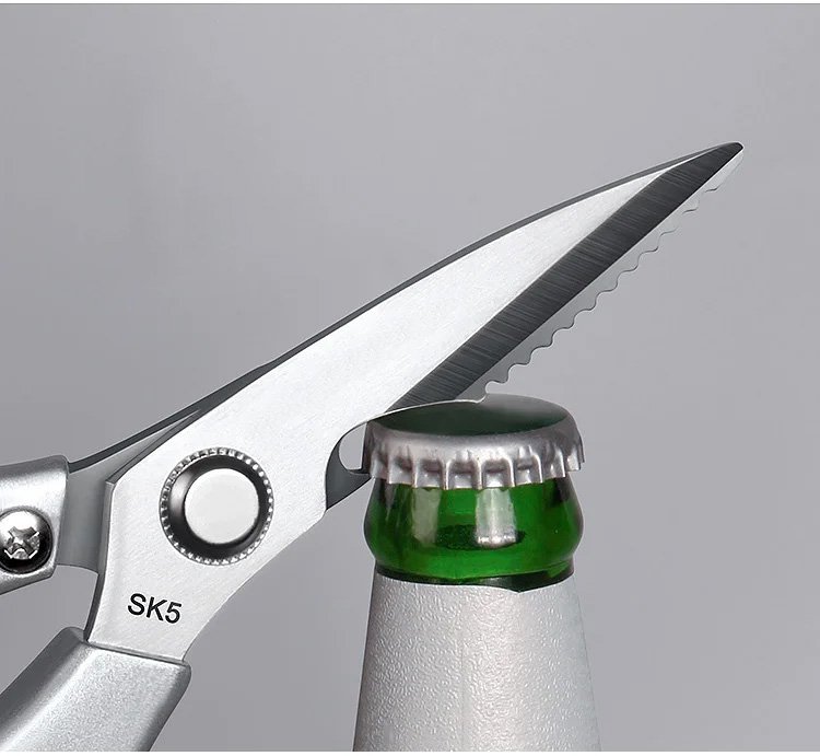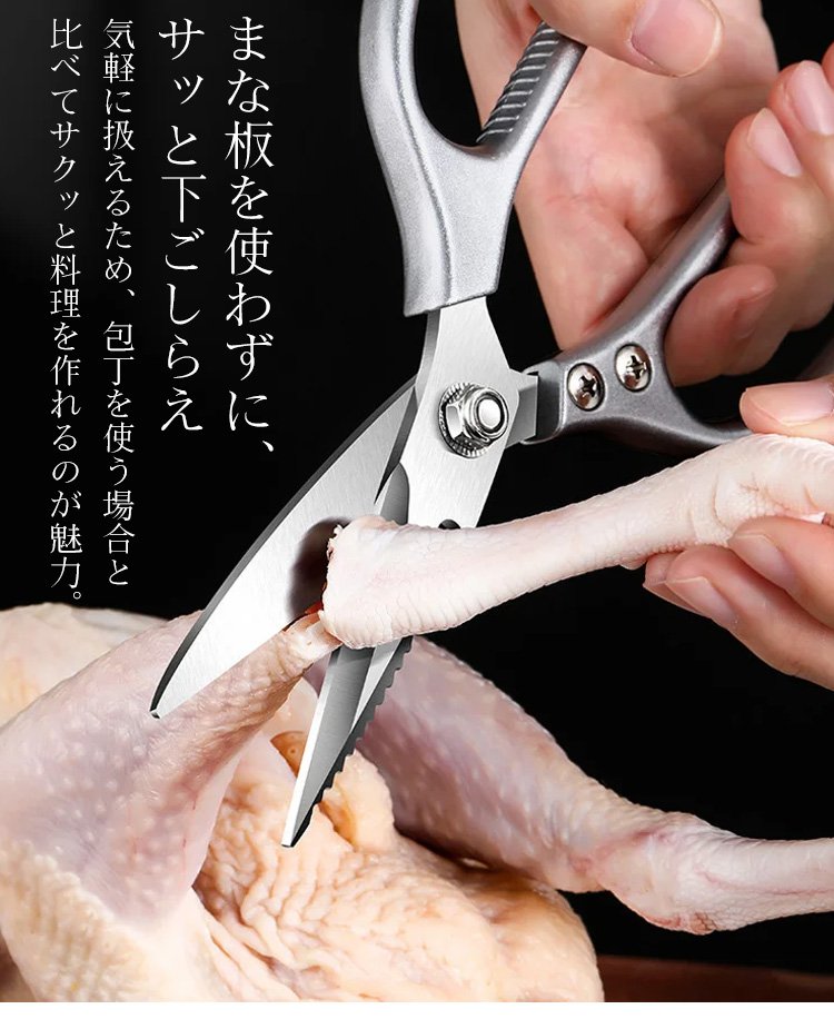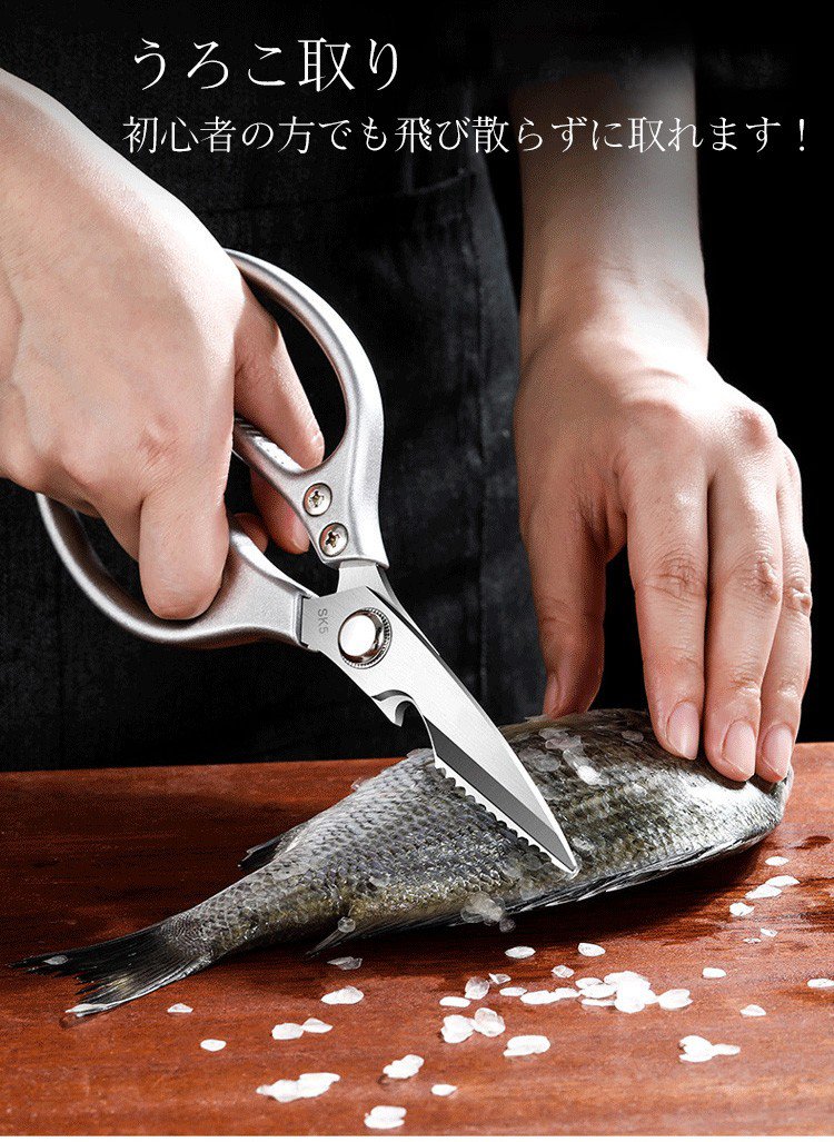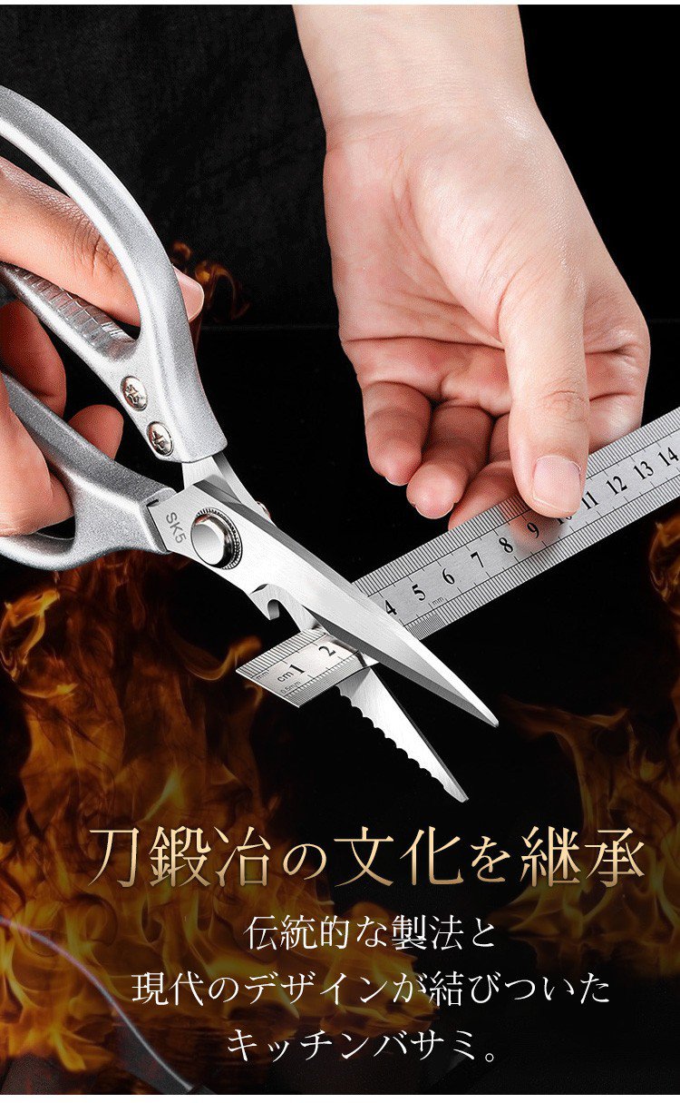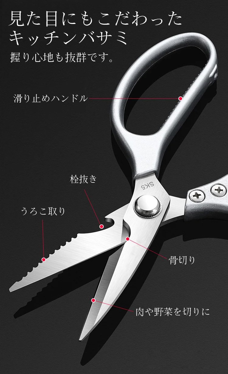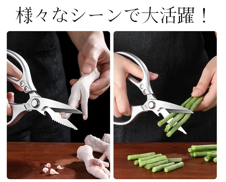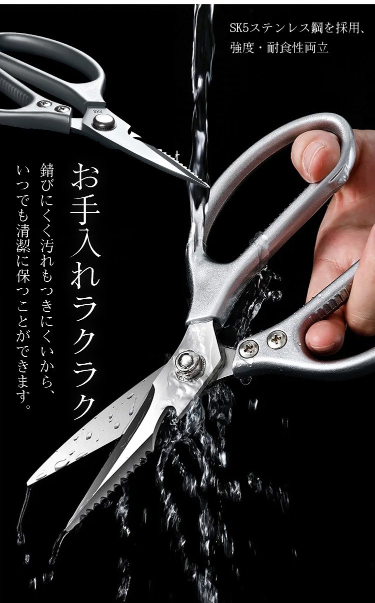 【多機能キッチンバサミ】SK5ステンレス鋼を採用、腐食に強くて、べたべたにもなりにくい!